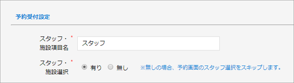 3)「予約受付設定」の「スタッフ・施設選択」を「無し」にする
