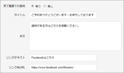 3)「完了画面での告知」を「有り」にする